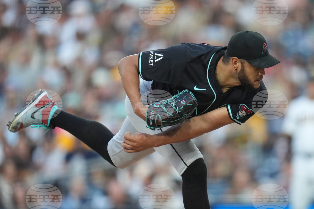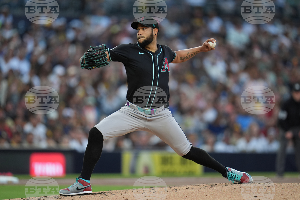 Arizona Diamondbacks starting pitcher Eduardo Rodriguez works against a San Diego Padres batter during the first inning of a baseball game Saturday, Sept. 27, 2025, in San Diego. (AP Photo/Gregory Bull)