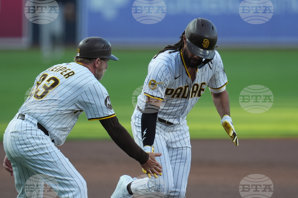 San Diego Padres' Fernando Tatis Jr., left, celebrates with third base coach Tim Leiper after hitting a home run during the first inning of a baseball game against the Arizona Diamondbacks Saturday, Sept. 27, 2025, in San Diego. (AP Photo/Gregory Bull)