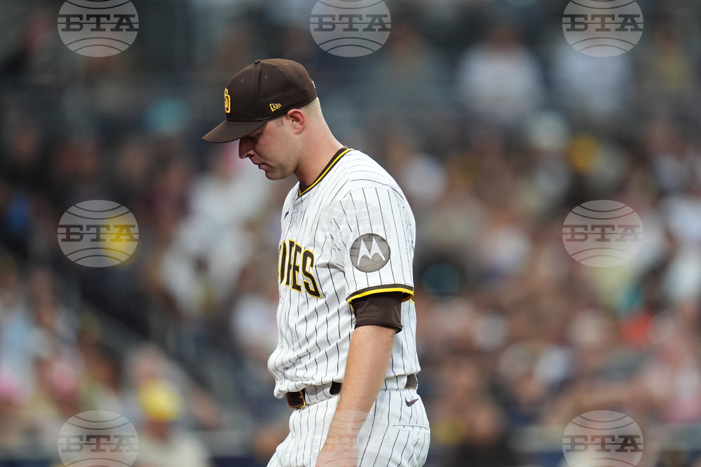 San Diego Padres starting pitcher Michael King exits during the third inning of a baseball game against the Arizona Diamondbacks Saturday, Sept. 27, 2025, in San Diego. (AP Photo/Gregory Bull)
