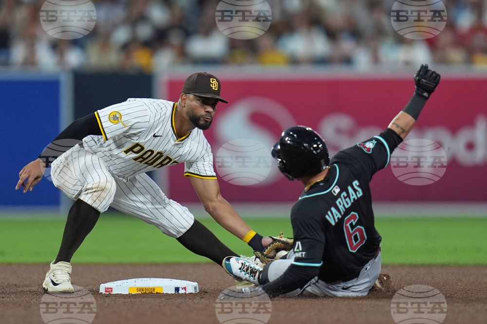 San Diego Padres shortstop Xander Bogaerts, left, tags out Arizona Diamondbacks' Ildemaro Vargas after trying to advance off a single during the fourth inning of a baseball game Saturday, Sept. 27, 2025, in San Diego. (AP Photo/Gregory Bull)