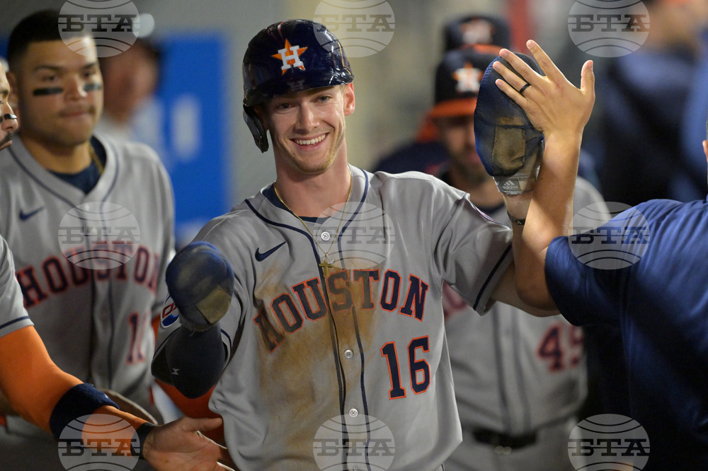 Houston Astros Zach Cole is congratulated in the dugout after scoring a run during the fourth inning of a baseball game against the Los Angeles Angels, Friday, Sept. 26, 2025, in Anaheim, Calif. (AP Photo/Jayne Kamin-Oncea)