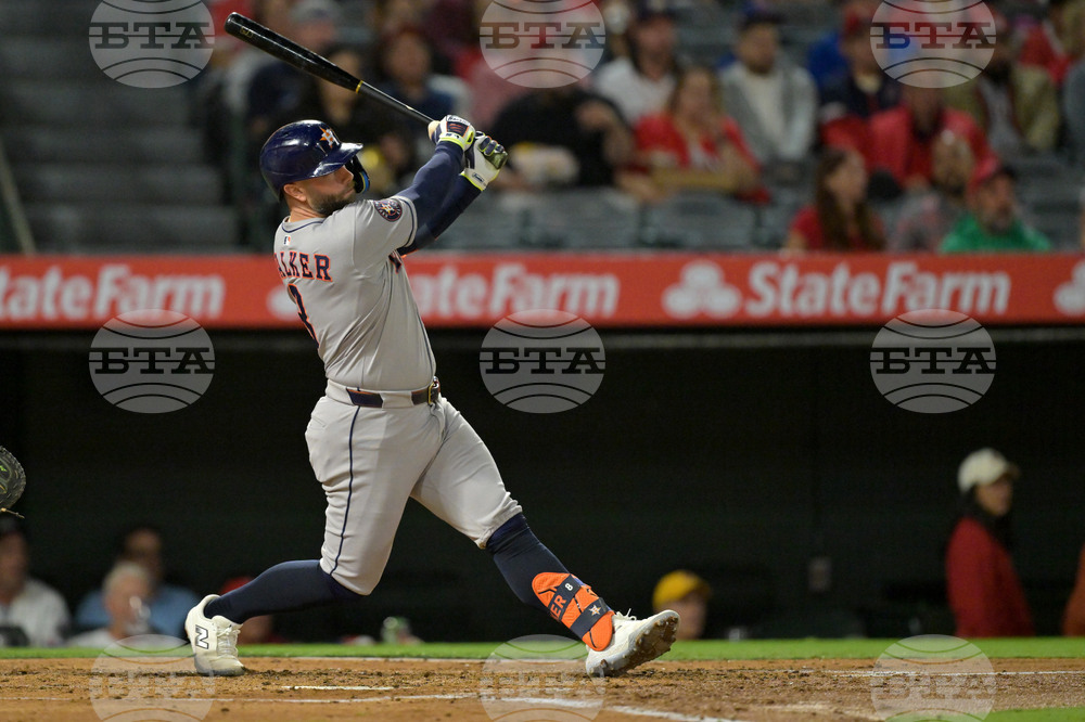 Houston Astros Christian Walker hits a solo home run during the fourth inning of a baseball game against the Los Angeles Angels, Friday, Sept. 26, 2025, in Anaheim, Calif. (AP Photo/Jayne Kamin-Oncea)