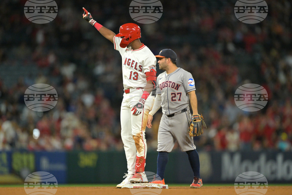 Los Angeles Angels Denzer Guzman (13) stands on second after a RBI double during the fourth inning of a baseball game against the Houston Astros, Friday, Sept. 26, 2025, in Anaheim, Calif. (AP Photo/Jayne Kamin-Oncea)
