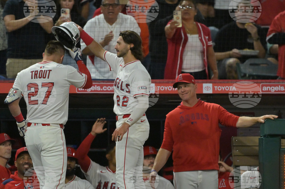 Los Angeles Angels interim manager Ray Montgomery, right, looks on as Angels' Mike Trout (27) is congratulated at the dugout by Angels' Bryce Teodosio after hitting a solo home run during the fourth inning of a baseball game against the Houston Astros, Friday, Sept. 26, 2025, in Anaheim, Calif. (AP Photo/Jayne Kamin-Oncea)