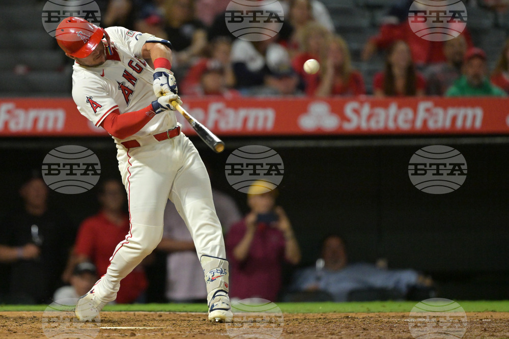 Los Angeles Angels' Mike Trout hits a solo home run during the eighth inning of a baseball game against the Houston Astros, Friday, Sept. 26, 2025, in Anaheim, Calif. (AP Photo/Jayne Kamin-Oncea)