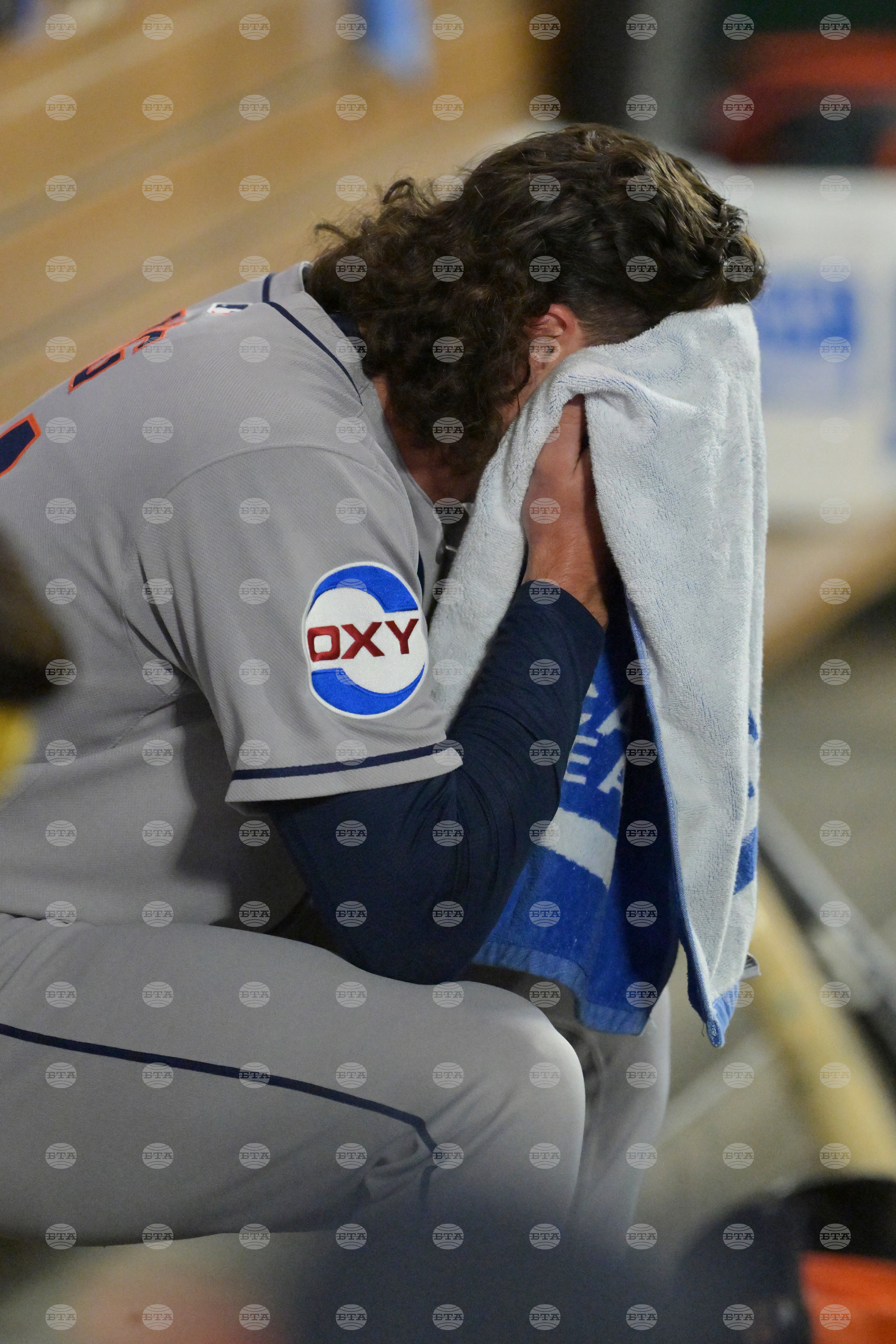 Houston Astros starting pitcher Jason Alexander buries his head in a towel after he was pulled during the fifth inning of a baseball game against the Los Angeles Angels, Friday, Sept. 26, 2025, in Anaheim, Calif. (AP Photo/Jayne Kamin-Oncea)