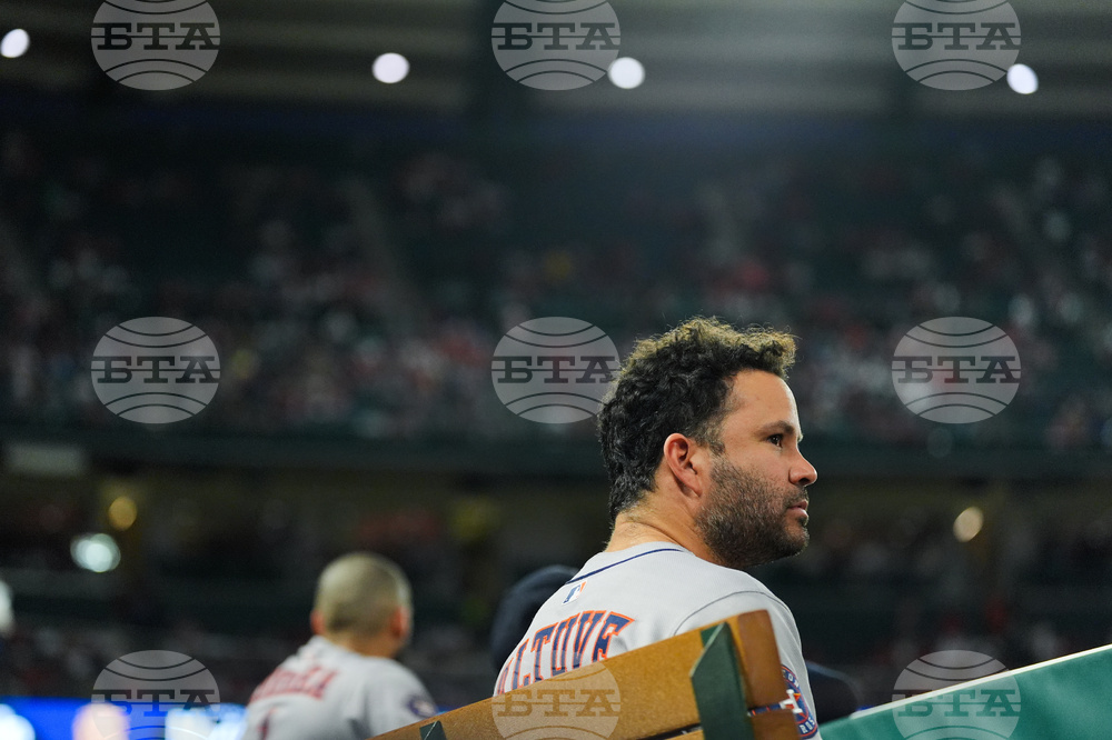 Houston Astros' Jose Altuve watches from the dugout during the second inning of a baseball game against the Los Angeles Angels Saturday, Sept. 27, 2025, in Anaheim, Calif. (AP Photo/Jae C. Hong)