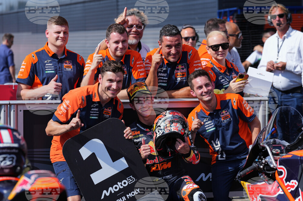 Argentinian rider Valentin Perrone of Red Bull KTM Tech3, center sitting, and his team members pose for a photo during the podium ceremony after finishing second in the Moto3 qualifying session at the Twin Ring Motegi circuit in Motegi, north of Tokyo, Saturday, Sept. 27, 2025, ahead of Sunday's Grand Prix of Japan. (AP Photo/Hiro Komae)