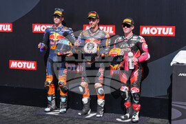 First placed Spanish rider Jose Antonio Rueda of Red Bull KTM Ajo KTM, center, second placed Argentinian rider Valentin Perrone of Red Bull KTM Tech3, left, third placed Australian rider Joel Kelso of LEVEL UP - MTA pose for a photo during the podium ceremony after the Moto3 qualifying session at the Twin Ring Motegi circuit in Motegi, north of Tokyo, Saturday, Sept. 27, 2025, ahead of Sunday's Grand Prix of Japan. (AP Photo/Hiro Komae)