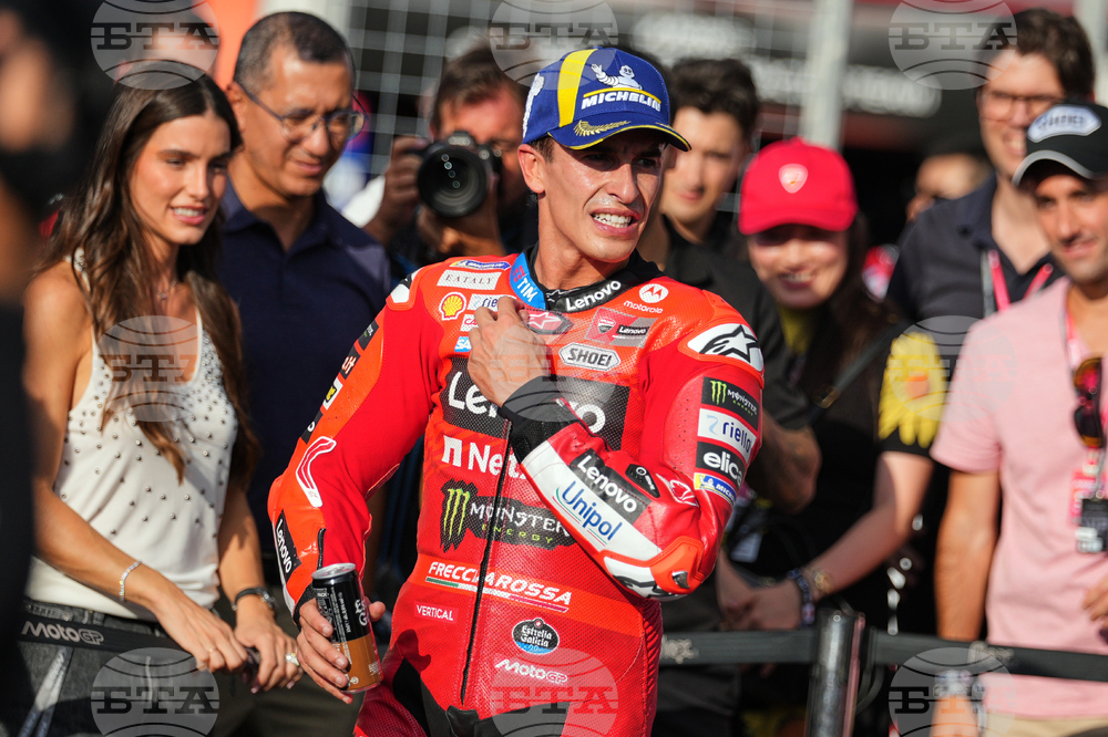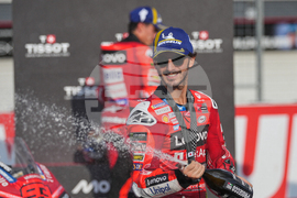 Italian rider Francesco Bagnaia of Ducati Lenovo Team prepares to have an interview before the podium ceremony after winning the MotoGP Sprint race at the Twin Ring Motegi circuit in Motegi, north of Tokyo, Saturday, Sept. 27, 2025, ahead of Sunday's Grand Prix of Japan. (AP Photo/Hiro Komae)