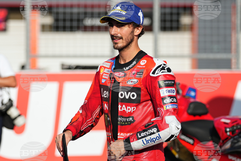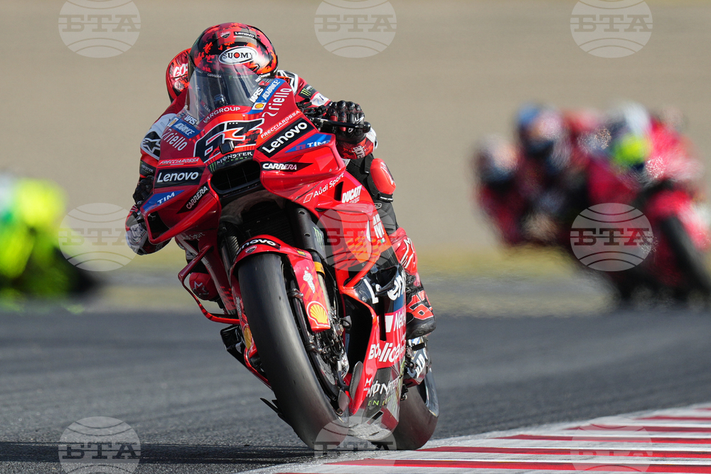 Italian rider Francesco Bagnaia of Ducati Lenovo Team steers his motorcycle during a MotoGP qualifying session at the Twin Ring Motegi circuit in Motegi, north of Tokyo, Saturday, Sept. 27, 2025, ahead of Sunday's Grand Prix of Japan. (AP Photo/Hiro Komae)