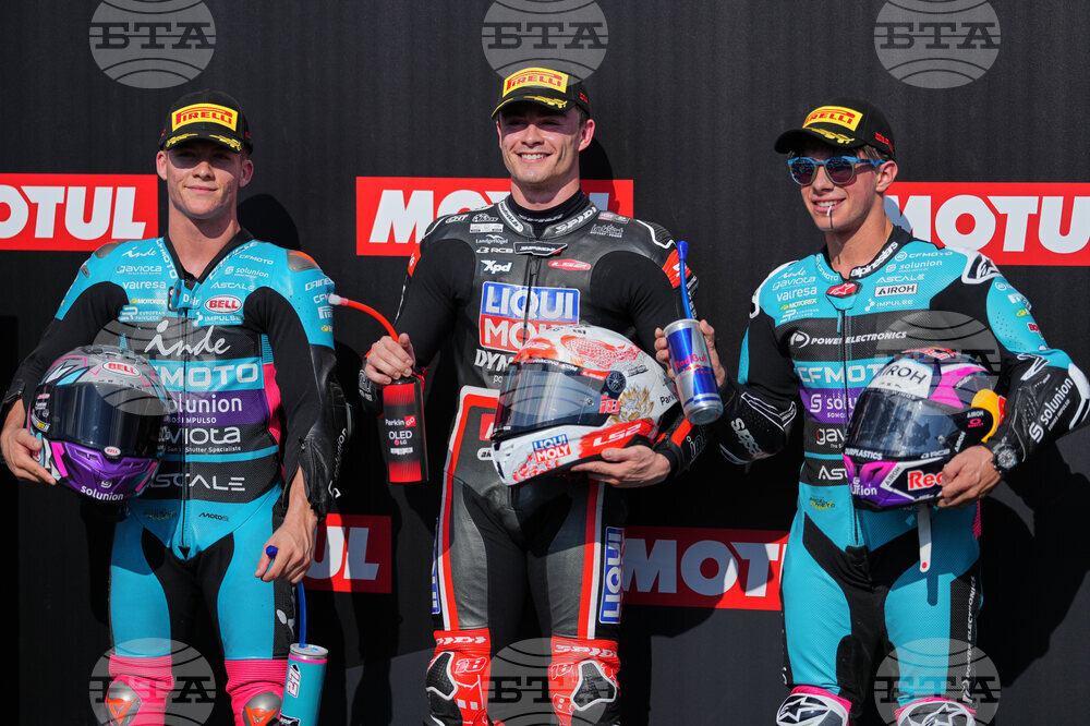 First placed Spanish rider Manuel Gonzalez of LIQUI MOLY Dynavolt Intact GP, center, second placed Spanish rider Daniel Holgado of CFMOTO Power Electronics Aspar Team, left, and third placed Colombian rider David Alonso of CFMOTO Power Electronics Aspar Team pose for a photo during the podium ceremony after the Moto2 qualifying session at the Twin Ring Motegi circuit in Motegi, north of Tokyo, Saturday, Sept. 27, 2025, ahead of Sunday's Grand Prix of Japan. (AP Photo/Hiro Komae)