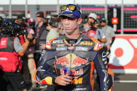 Third placed Spanish rider Pedro Acosta of Red Bull KTM Factory Racing prepares for the podium ceremony after the MotoGP Sprint race at the Twin Ring Motegi circuit in Motegi, north of Tokyo, Saturday, Sept. 27, 2025, ahead of Sunday's Grand Prix of Japan. (AP Photo/Hiro Komae)