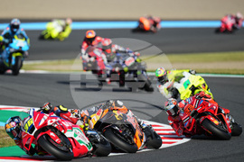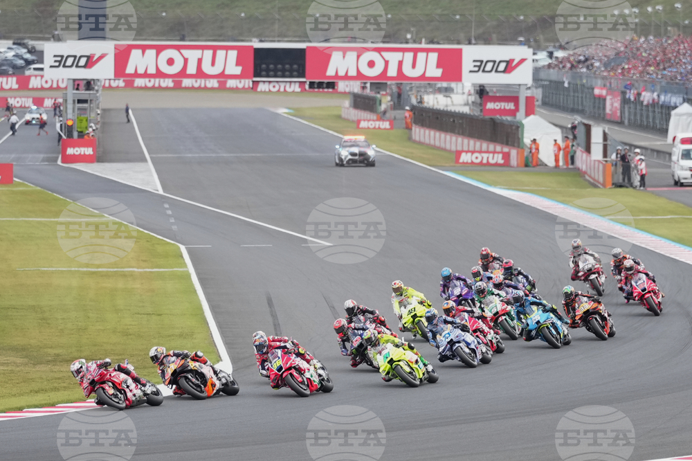 Italian rider Francesco Bagnaia of Ducati Lenovo Team, left, leads the start of MotoGP race during the Grand Prix of Japan at the Twin Ring Motegi circuit in Motegi, north of Tokyo, Sunday, Sept. 28, 2025. (AP Photo/Hiro Komae)