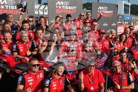 Ducati Lenovo Team members including first placed Italian rider Francesco Bagnaia, center right, and second placed Spanish rider Marc Marquez, center left, holding their medals, pose for a photo after the MotoGP Sprint race at the Twin Ring Motegi circuit in Motegi, north of Tokyo, Saturday, Sept. 27, 2025, ahead of Sunday's Grand Prix of Japan. (AP Photo/Hiro Komae)