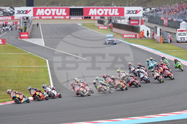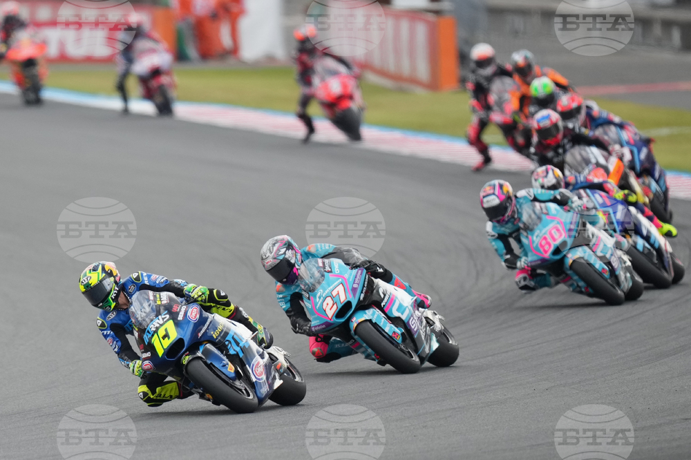 Brazilian rider Diogo Moreira of Italtrans Racing Team, left, follow by Spanish rider Daniel Holgado of CFMOTO Power Electronics Aspar Team, during the start of the Moto2 race during the Grand Prix of Japan at the Twin Ring Motegi circuit in Motegi, north of Tokyo, Sunday, Sept. 28, 2025. (AP Photo/Hiro Komae)