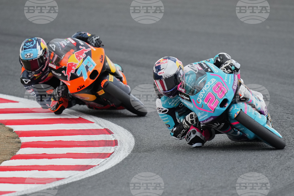 Spanish rider Maximo Quiles of CFMOTO Gaviota Aspar Team, right, steers his motorcycle as he follow by Argentinian rider Valentin Perrone of Red Bull KTM Tech3 during the Moto3 race of the Grand Prix of Japan at the Twin Ring Motegi circuit in Motegi, north of Tokyo, Sunday, Sept. 28, 2025. (AP Photo/Hiro Komae)