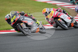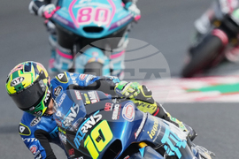 Italian rider Riccardo Rossi of Rivacold Snipers Team, left, steers his motorcycle as he follow by Australian rider Joel Kelso of LEVEL UP - MTA during the Moto3 race of the Grand Prix of Japan at the Twin Ring Motegi circuit in Motegi, north of Tokyo, Sunday, Sept. 28, 2025. (AP Photo/Hiro Komae)