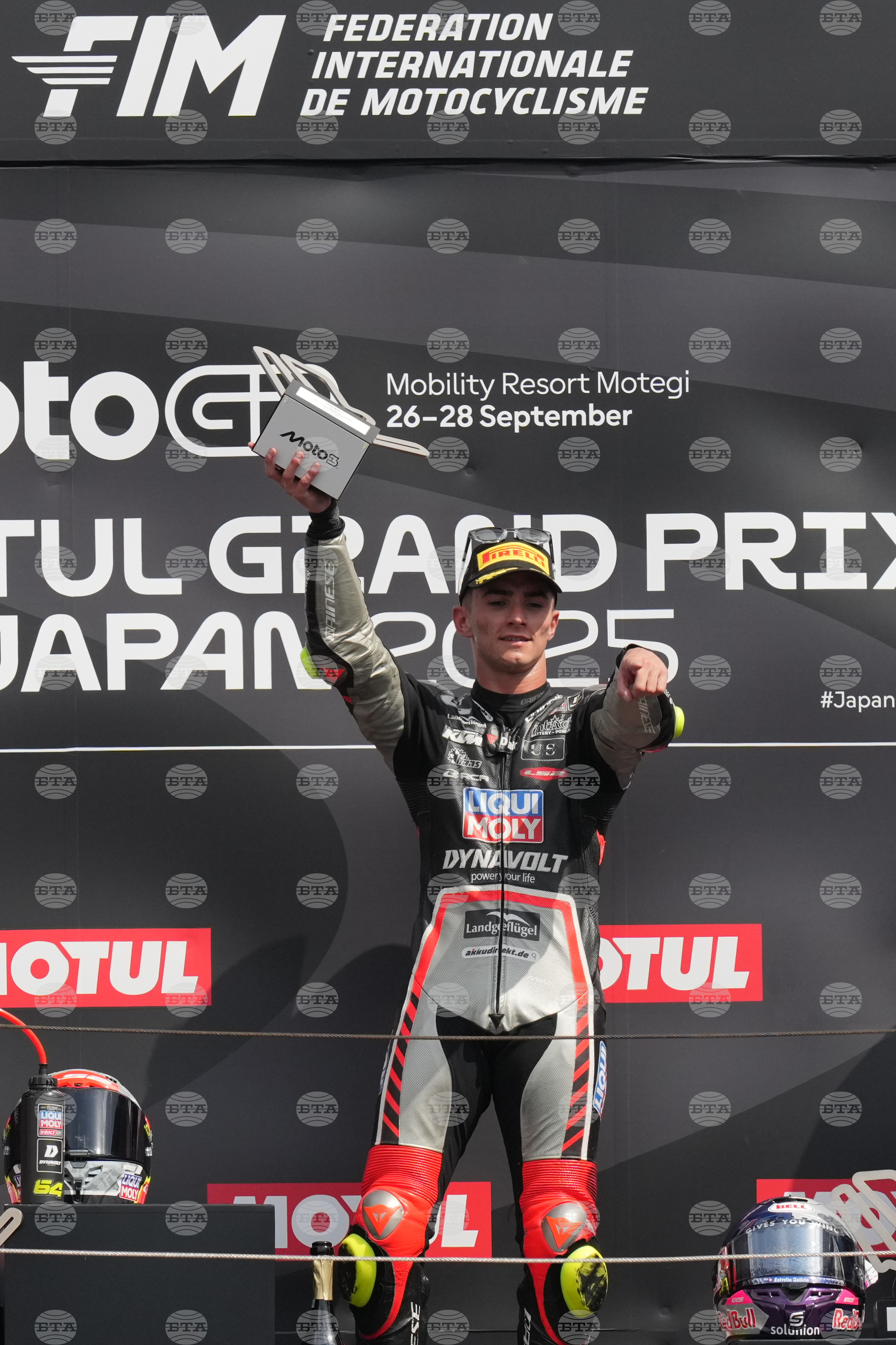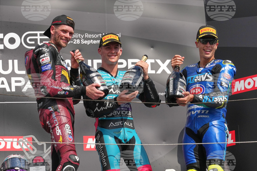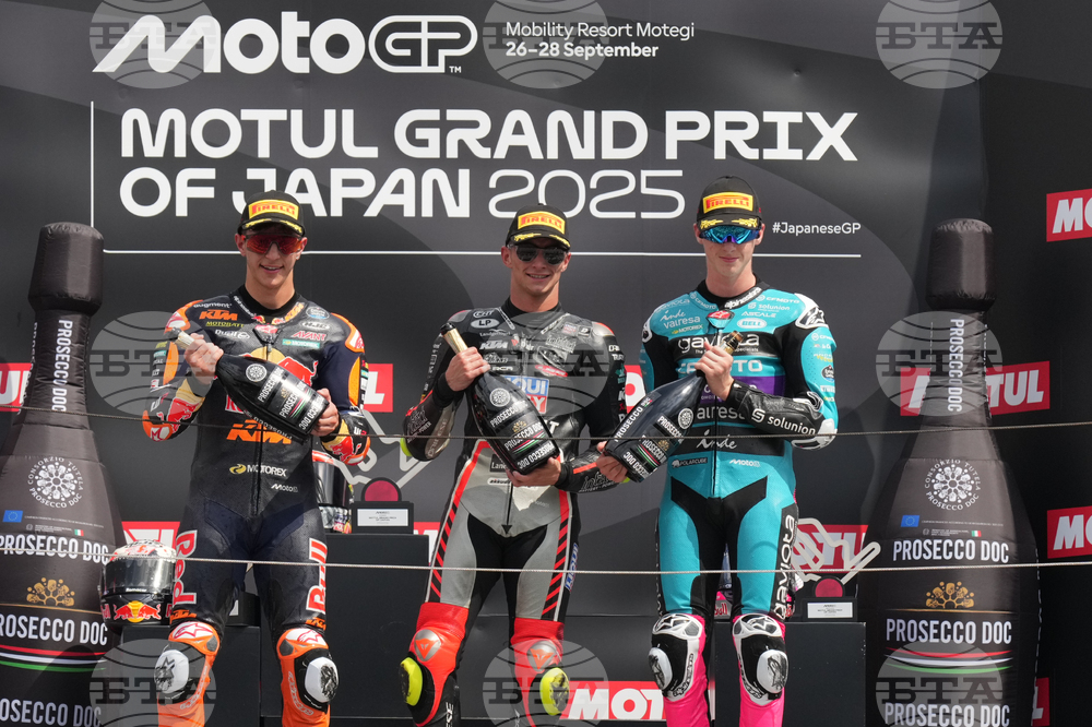 Moto2 second place, British rider Jake Dixon of ELF Marc VDS Racing Team, left, First place, Spanish rider Daniel Holgado of CFMOTO Power Electronics Aspar Team, center, and third place Brazilian rider Diogo Moreira of Italtrans Racing Team celebrates after winning Moto2 race for Grand Prix of Japan at the Motegi circuit in Motegi, north of Tokyo, Sunday, Sept. 28, 2025. (AP Photo/Hiro Komae)