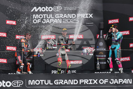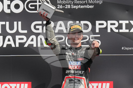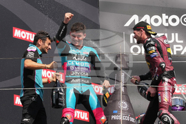 First place winner Spanish rider Daniel Holgado of CFMOTO Power Electronics Aspar Team, centre, celebrates with Moto2 second place, British rider Jake Dixon of ELF Marc VDS Racing Team, right, after winning Moto2 race for Grand Prix of Japan at the Motegi circuit in Motegi, north of Tokyo, Sunday, Sept. 28, 2025. (AP Photo/Hiro Komae)