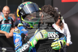 Brazilian rider Diogo Moreira of Italtrans Racing Team celebrates with his team after winning second placecMoto2 race for Grand Prix of Japan at the Twin Ring Motegi circuit in Motegi, north of Tokyo, Sunday, Sept. 28, 2025. (AP Photo/Hiro Komae)