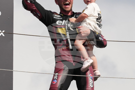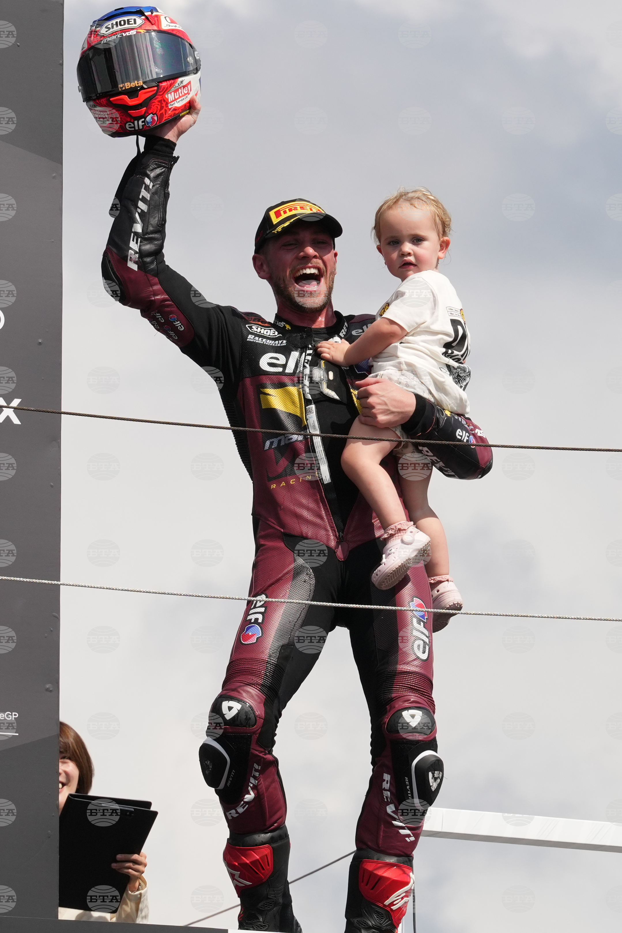 British rider Jake Dixon of ELF Marc VDS Racing Team, celebrates after winning Moto2 third place for Grand Prix of Japan at the Twin Ring Motegi circuit in Motegi, north of Tokyo, Sunday, Sept. 28, 2025. (AP Photo/Hiro Komae)