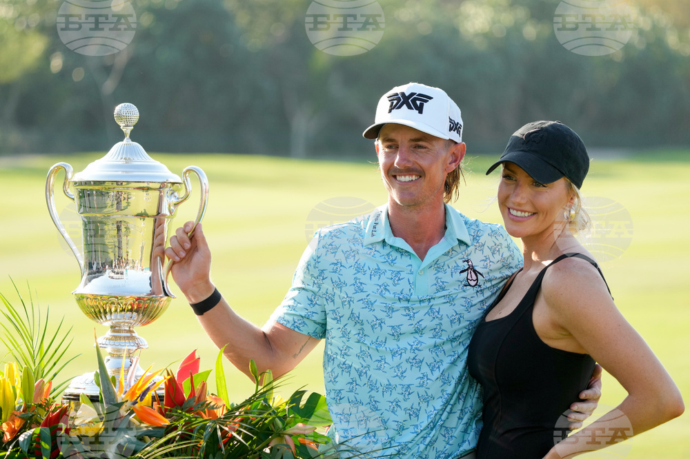 FILE - Jake Knapp, of the United States, and his girlfriend Makena White pose with his trophy during the award ceremony after winning the Mexico Open golf tournament in Puerto Vallarta, Mexico, Sunday, Feb. 25, 2024. (AP Photo/Fernando Llano, File)
