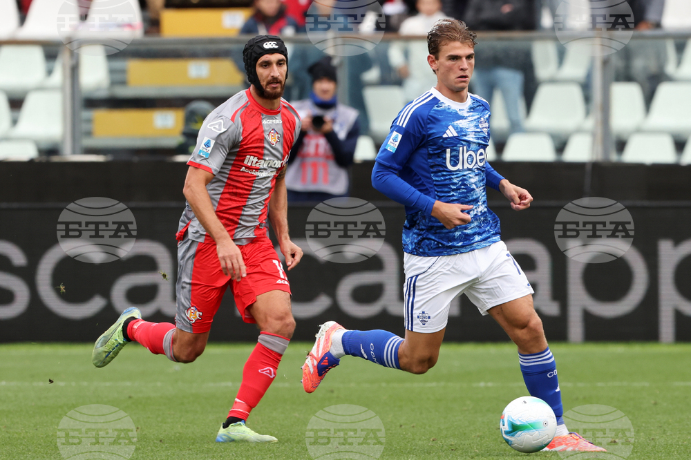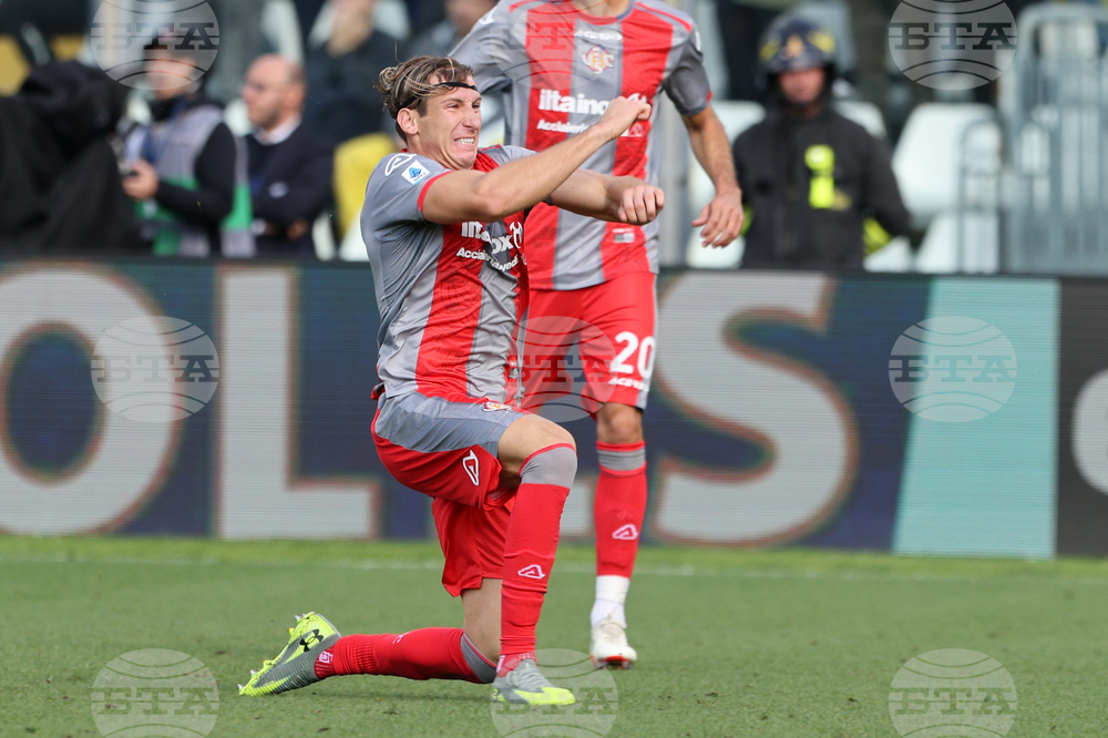 Cremonese's Federico Baschirotto celebrates scoring during the Serie A soccer match between Como and Cremonese at the Giuseppe Sinigaglia stadium in Como, Italy, Saturday Sept. 27, 2025. (Antonio Saia/LaPresse via AP)