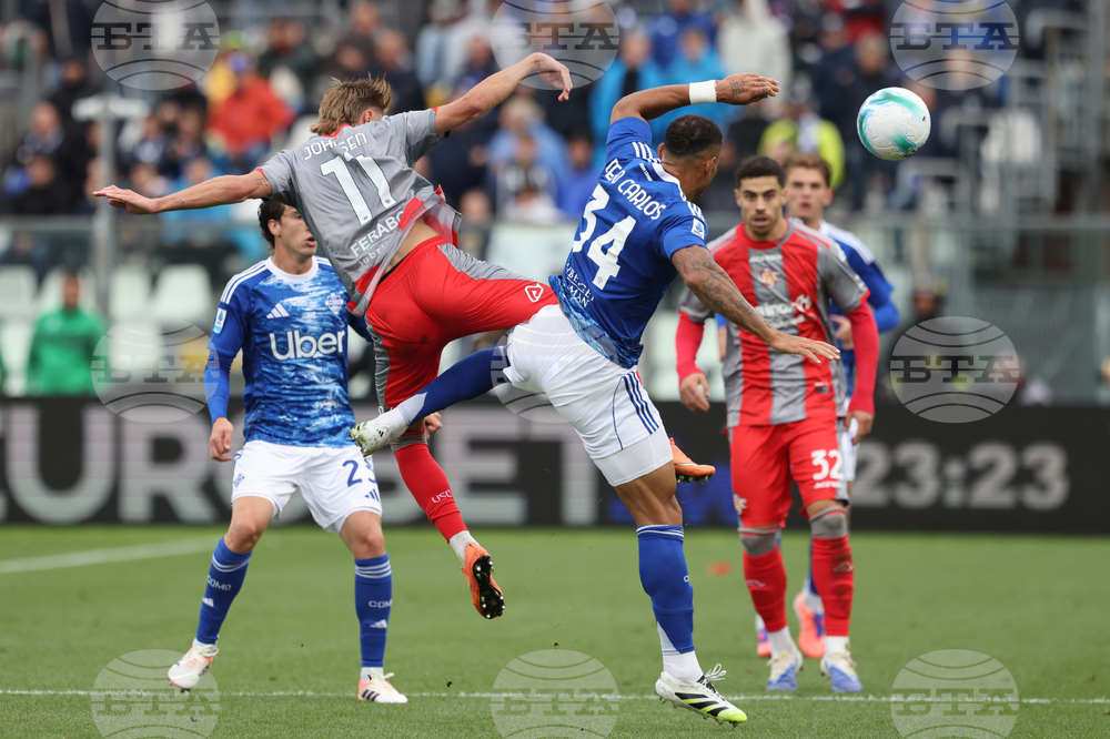 Como's Diego Carlos, center right and Cremonese's Dennis Johnsen in action during the Serie A soccer match between Como and Cremonese at the Giuseppe Sinigaglia stadium in Como, Italy, Saturday Sept. 27, 2025. (Antonio Saia/LaPresse via AP)