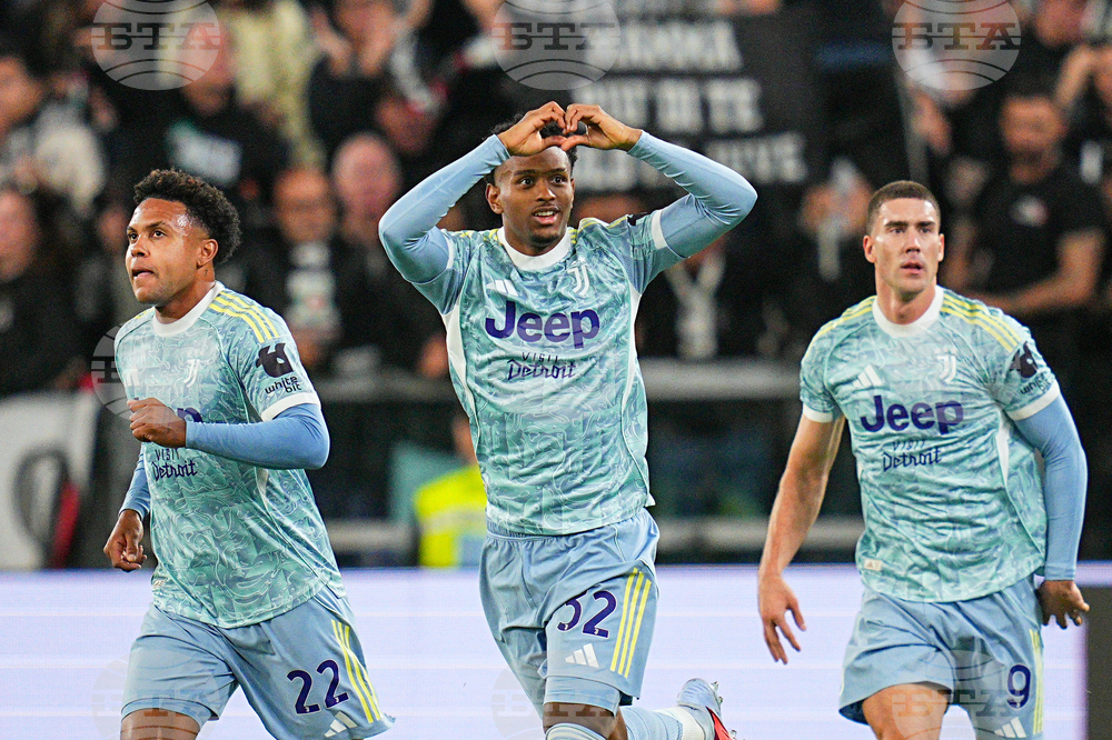 Atalanta's Kamaldeen Sulemana celebrates after scoring, during the Serie A soccer match between Juventus and Atalanta at the Allianz Stadium in Turin, north west Italy, Saturday, Sept. 27, 2025. (Marco Alpozzi/LaPresse via AP)
