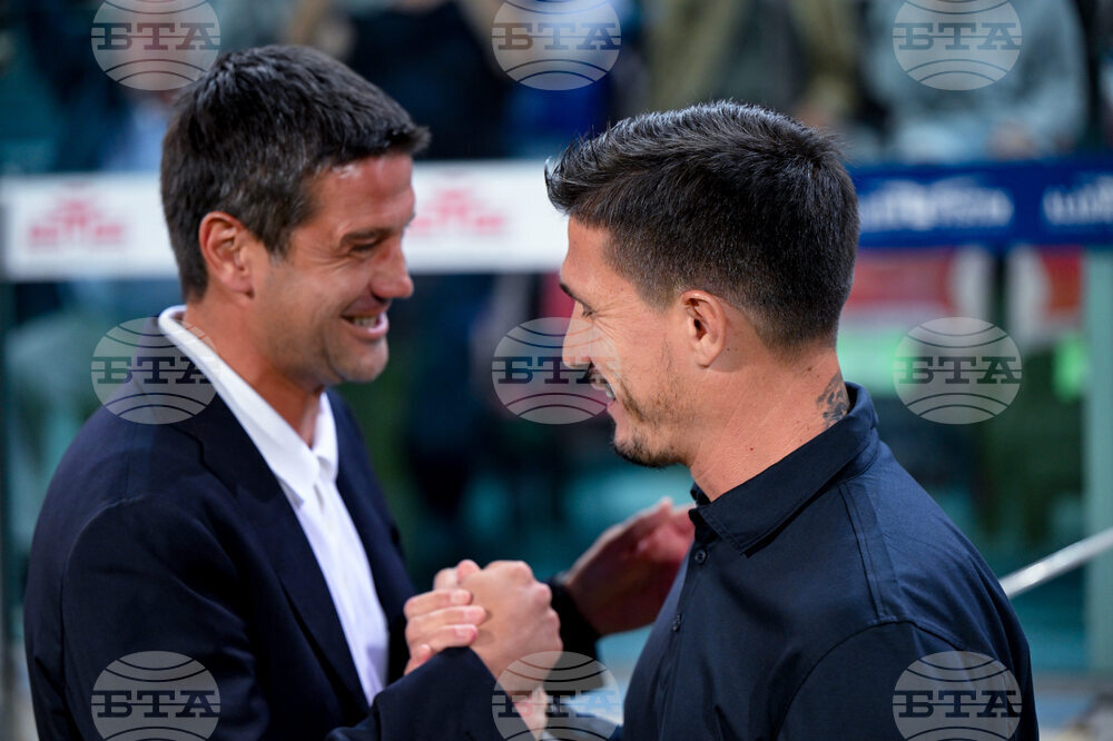 Cagliari's coach Fabio Pisacane and Inter's coach Cristian Chivu react, ahead of a Serie A soccer match between Cagliari Calcio and Inter at the Unipol Domus in Cagliari, Italy, Saturday, Sept. 27, 2025. (Gianluca Zuddas/LaPresse via AP)
