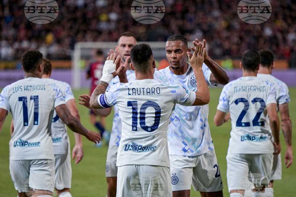 Inter's Lautaro Javier Martinez, center, celebrates scoring during the Serie A soccer match between Cagliari Calcio and Inter at the Unipol Domus in Cagliari, Sardinia, Italy, Saturday Sept. 27, 2025. (Gianluca Zuddas/LaPresse via AP)