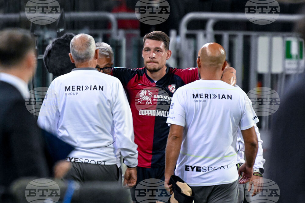 Cagliari's Andrea Belotti, center, is helped following an injury during the Serie A soccer match between Cagliari Calcio and Inter Milan at the Unipol Domus in Cagliari, Italy. (Gianluca Zuddas/LaPresse via AP)