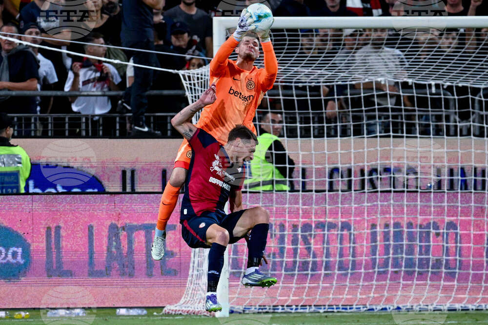 Cagliari's Andrea Belotti, bottom, gets injured as Inter goalkeeper Josep Martínez grabs the ball during the Serie A soccer match between Cagliari Calcio and Inter Milan at the Unipol Domus in Cagliari, Italy. (Gianluca Zuddas/LaPresse via AP)