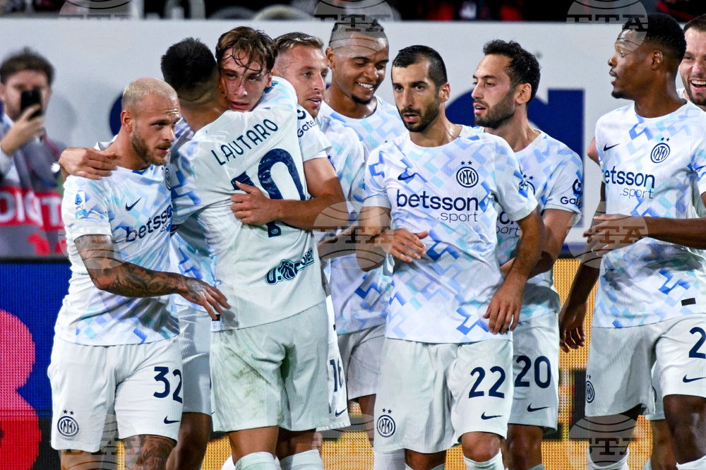 Inter's Francesco Esposito celebrates after scoring the goal during the Serie A soccer match between Cagliari Calcio and Inter Milan at the Unipol Domus in Cagliari, Italy. (Gianluca Zuddas/LaPresse via AP)