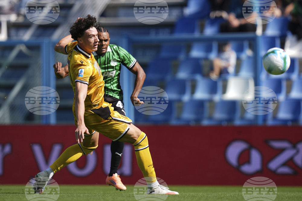 Sassuolo's Sebastian Walukiewicz, left, fights for the ball with Udinese's Jordan Zemura, back to camera, and Udinese's Arthur Atta during a Serie A soccer match between Sassuolo and Udinese at the Mapei Stadium, in Reggio Emilia, Italy, Sunday, Sept. 28, 2025. (Massimo Paolone/LaPresse via AP)