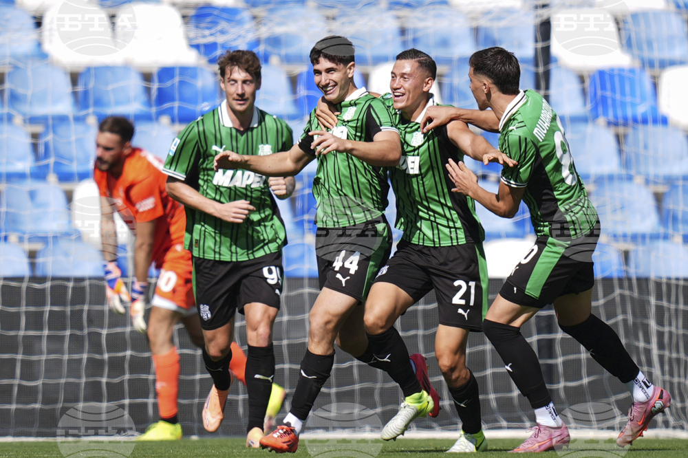 Sassuolo's Edoardo Iannoni, center, celebrates after scoring his side's third goal during a Serie A soccer match between Sassuolo and Udinese at the Mapei Stadium, in Reggio Emilia, Italy, Sunday, Sept. 28, 2025. (Massimo Paolone/LaPresse via AP)