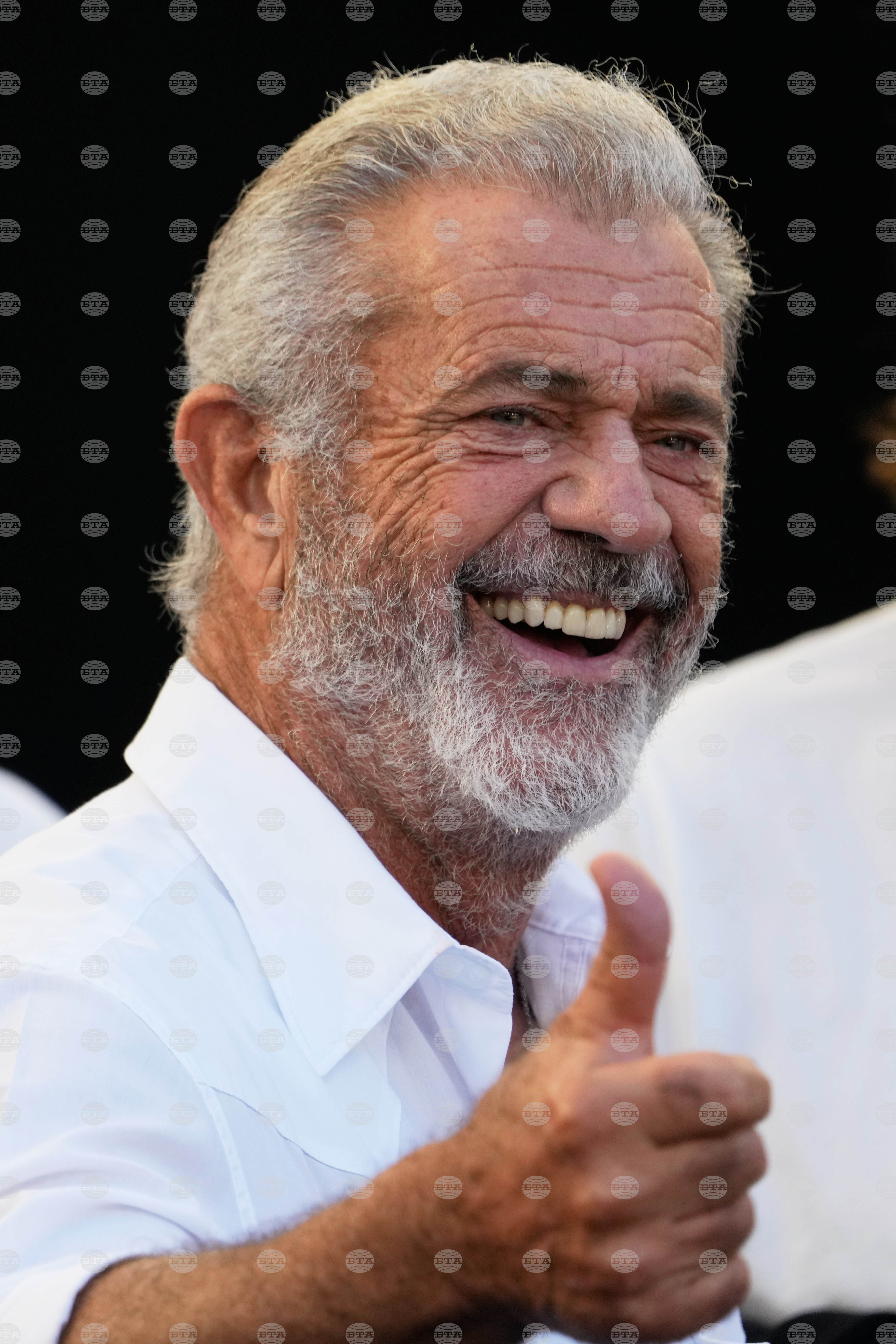 Mel Gibson gives the thumbs up sign prior to the start of the Serie A soccer match between Roma and Verona at Rome's Olympic Stadium, Sunday, Sept. 28, 2025. (AP Photo/Gregorio Borgia)