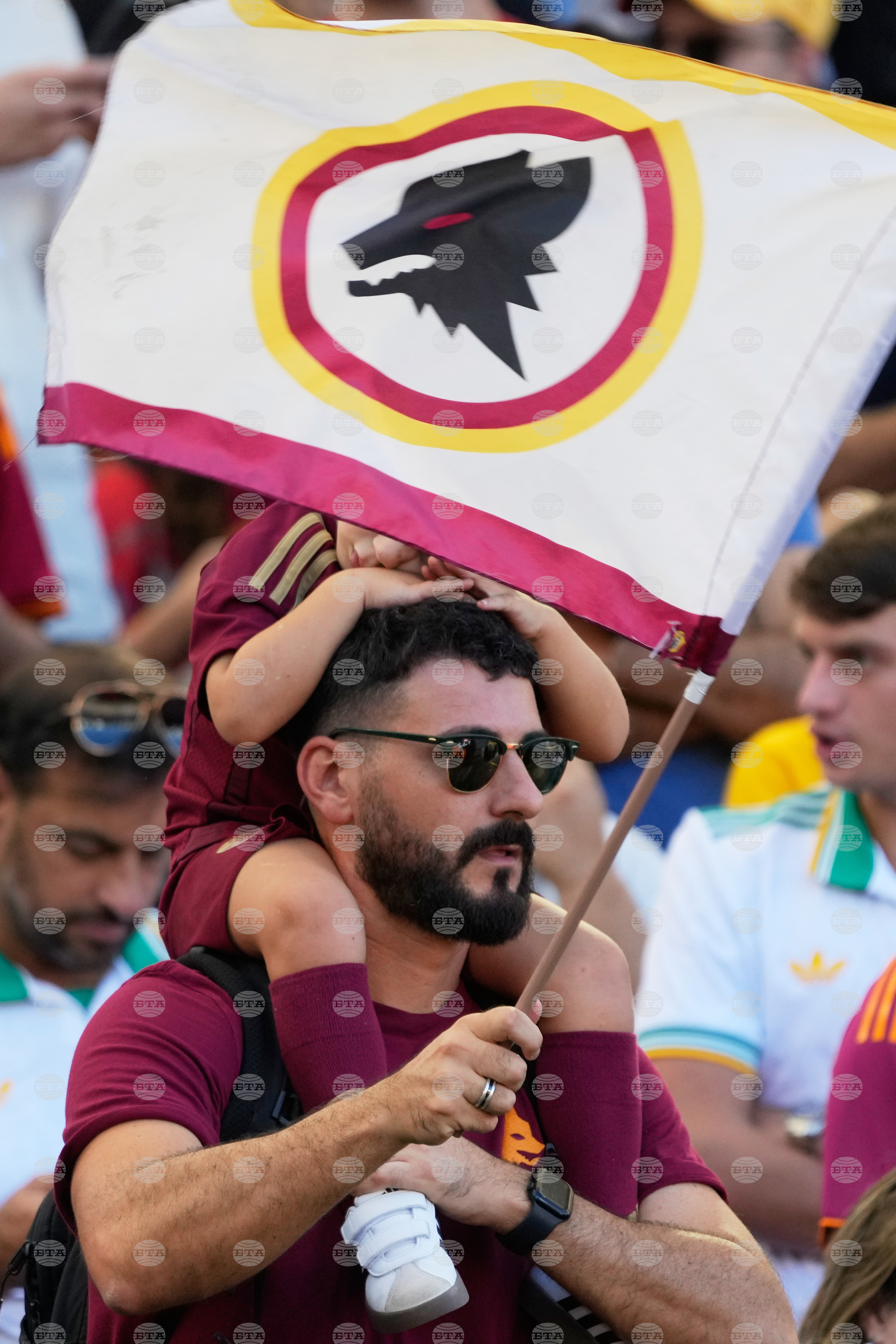 Roma's fans wait for the start of the Serie A soccer match between Roma and Verona at Rome¥s Olympic Stadium, Sunday, Sept. 28, 2025. (AP Photo/Gregorio Borgia)