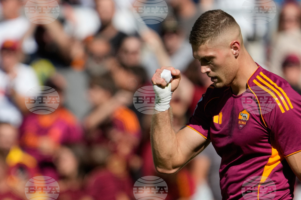 Roma's Artem Dovbyk celebrates after scoring during the Serie A soccer match between Roma and Verona at Rome¥s Olympic Stadium, Sunday, Sept. 28, 2025. (AP Photo/Gregorio Borgia)