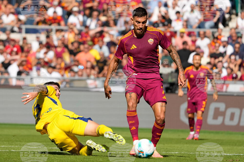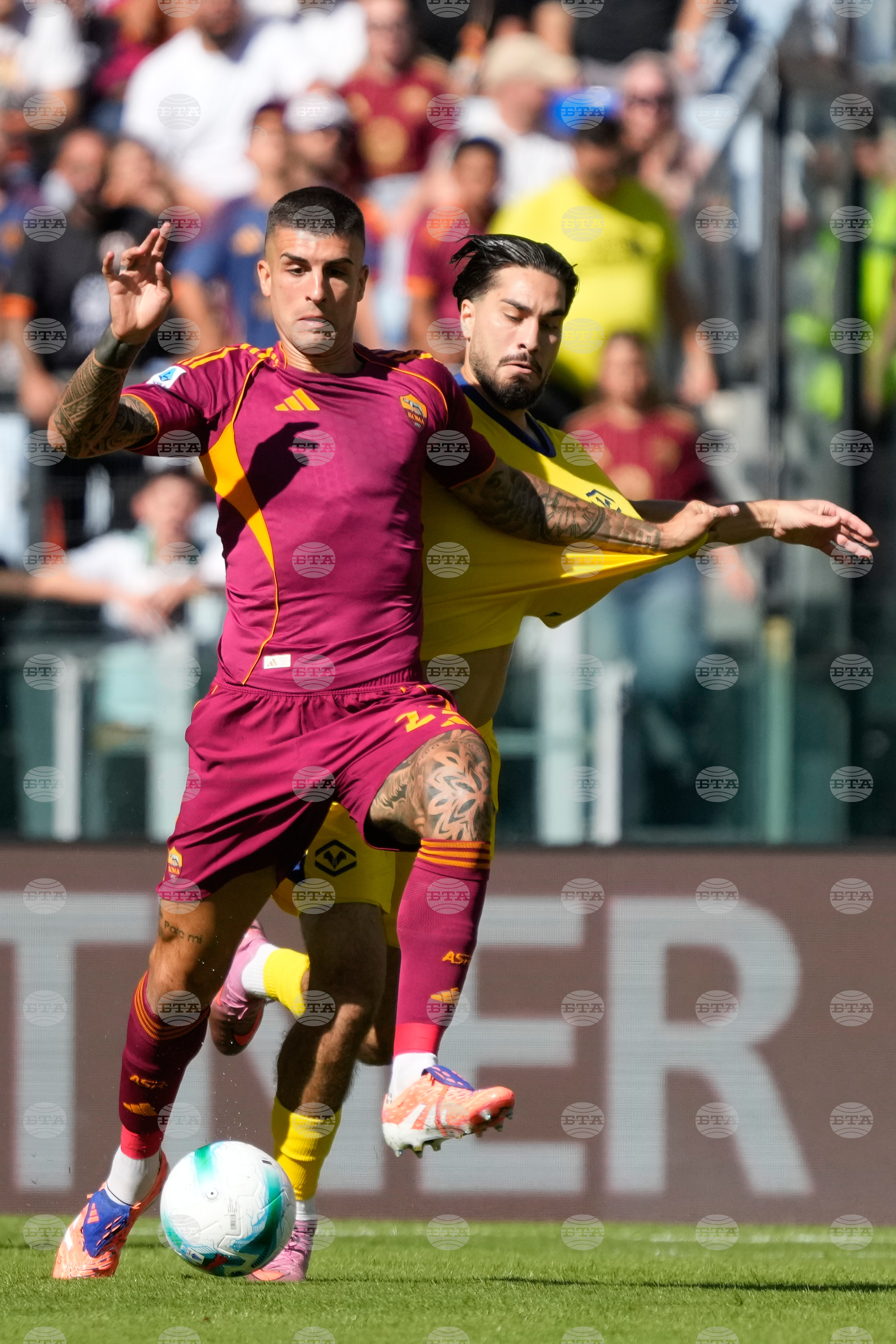 Roma's Gianluca Mancini, left, and Verona's Suat Serder vie for the ball during the Serie A soccer match between Roma and Verona at Rome¥s Olympic Stadium, Sunday, Sept. 28, 2025. (AP Photo/Gregorio Borgia)