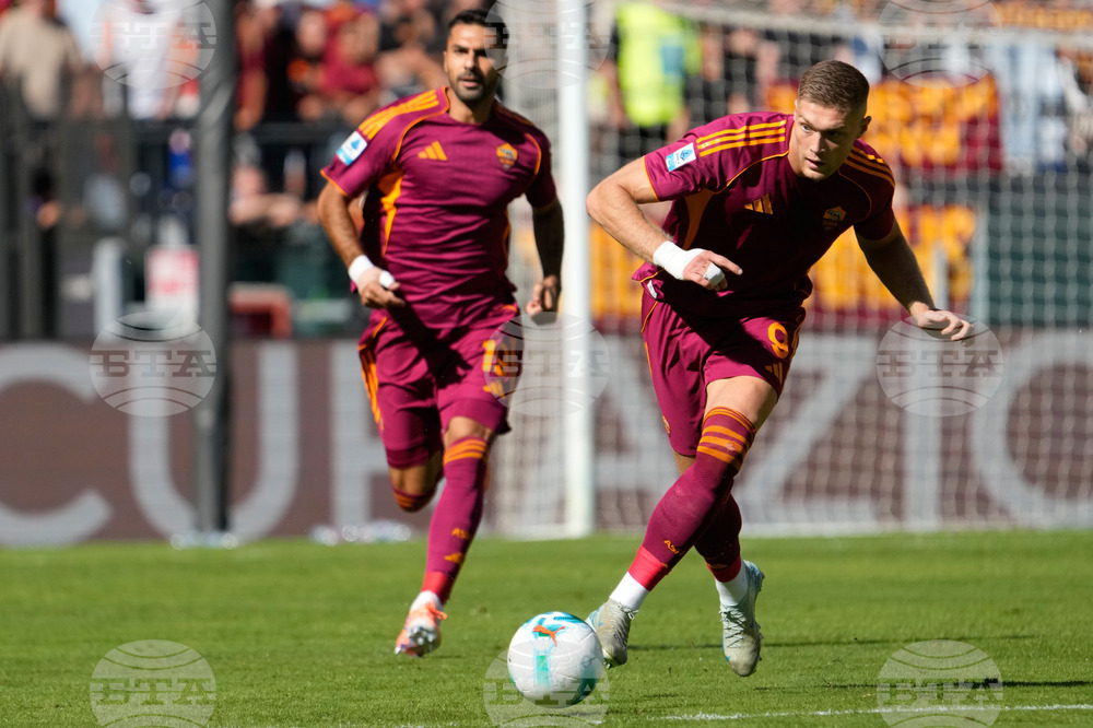 Roma's Artem Dovbyk passes the ball during the Serie A soccer match between Roma and Verona at Rome¥s Olympic Stadium, Sunday, Sept. 28, 2025. (AP Photo/Gregorio Borgia)