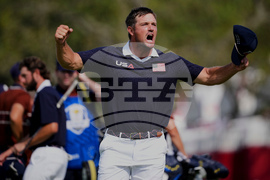 Europe's Justin Rose celebrates after a putt on the seventh hole at Bethpage Black golf course during the Ryder Cup golf tournament, Saturday, Sept. 27, 2025, in Farmingdale, N.Y. (AP Photo/Lindsey Wasson)