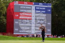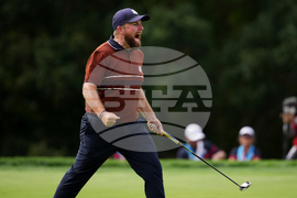 United States captain Keegan Bradley reacts on the second hole at Bethpage Black golf course during the Ryder Cup golf tournament, Saturday, Sept. 27, 2025, in Farmingdale, N.Y. (AP Photo/Robert Bukaty)