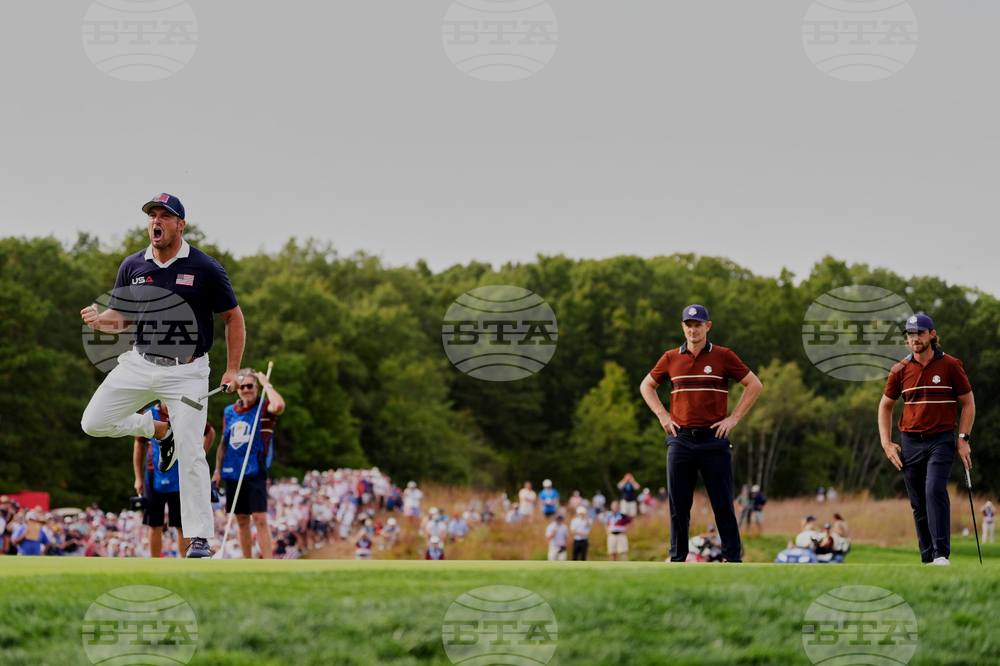 United States' Bryson DeChambeau celebrates after a putt on the 11th hole at Bethpage Black golf course during the Ryder Cup golf tournament, Saturday, Sept. 27, 2025, in Farmingdale, N.Y. (AP Photo/Lindsey Wasson)