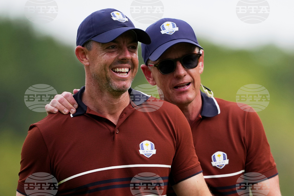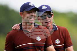 Europe captain Luke Donald and Rory McIlroy celebrates after a putt on the 15th hole at Bethpage Black golf course during the Ryder Cup golf tournament, Saturday, Sept. 27, 2025, in Farmingdale, N.Y. (AP Photo/Matt Slocum)