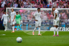 Real Madrid players stand after Atletico Madrid's Antoine Griezmann scored his side's fifth goal during the Spanish La Liga soccer match between Atletico Madrid and Real Madrid at Metropolitano stadium, in Madrid, Spain, Saturday, Sept. 27, 2025. (AP Photo/Manu Fernandez)