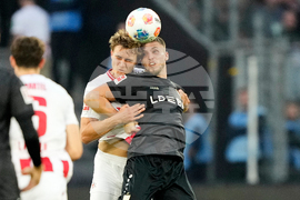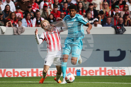 Cologne's Jakub Kaminski, left, vie for the ball with Stuttgart's Maximilian Mittelstaedt during the German Bundesliga soccer match between Cologne and Stuttgart in Cologne, Germany, Sunday, Sept. 28, 2025. (AP Photo/Martin Meissner)
