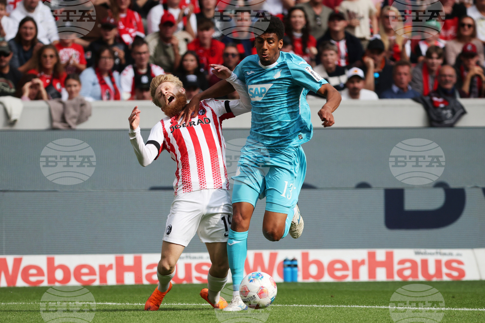 Freiburg's Jan-Niklas Beste, left, and Hoffenheim's Bernardo in action during Bundesliga soccer match between SC Freiburg and TSG 1899 Hoffenheim at Europa-Park Stadium, Freiburg, Germany, Sunday Sept. 28, 2025. (Philipp von Ditfurth/dpa via AP)