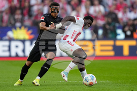 Cologne's Ragnar Ache jumps for a header during the German Bundesliga soccer match between 1.FC Köln and VfB Stuttgart in Cologne, Germany, Sunday, Sept. 28, 2025. (AP Photo/Martin Meissner)